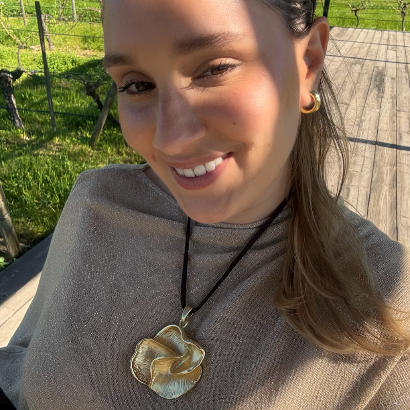 La flor dorada cuelga como joya central, capturando la luz con cada movimiento. Perfecto para quienes buscan un accesorio versátil que funciona tanto en looks casuales como en ocasiones especiales.