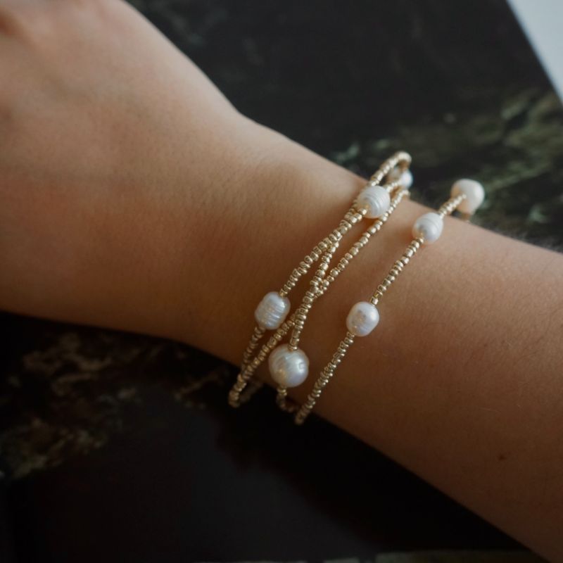 Collar versátil que combina mostacillas plateadas brillantes con delicadas perlas de río en un largo generoso. Úsalo como collar doble envolvente para un look sofisticado, o enróllalo varias veces en tu muñeca como pulsera statement. La mezcla de texturas y el brillo plateado crean un accesorio luminoso perfecto para cualquier ocasión. ¡Dos estilos en uno!